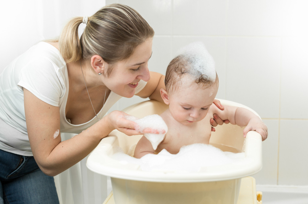 Los primeros días de vida no es necesario un baño diario, es más no es recomendable sumergirlos en su bañerita hasta que no haya caído el cordón umbilical. Hasta este momento puedes utilizar una manopla o esponja suave y húmeda con un jabón SYNDET o un aceite que cuide e hidrate su piel.